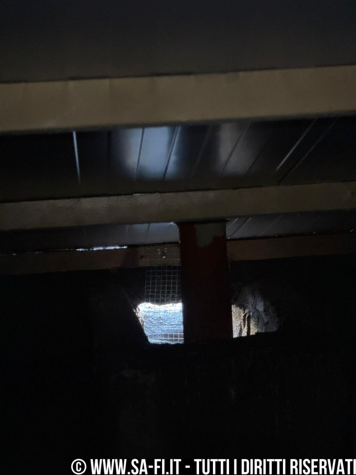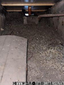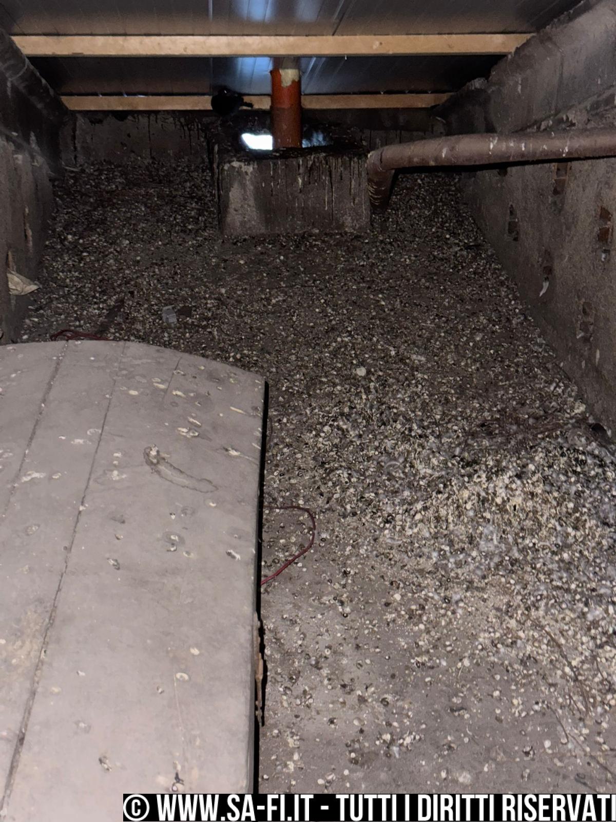 Un varco apparentemente secondario si trasforma in un punto di accesso stabile per i piccioni, con accumulo massiccio di guano, nidificazione e gravi condizioni igienico-sanitarie (possibili carcasse, zecche e scarafaggi).